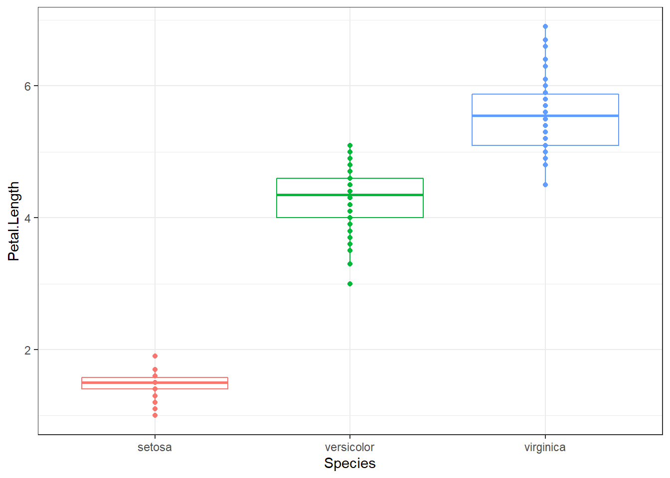 ggplot(data = iris, aes(x = Species, y = Petal.Length, colour = Species)) +