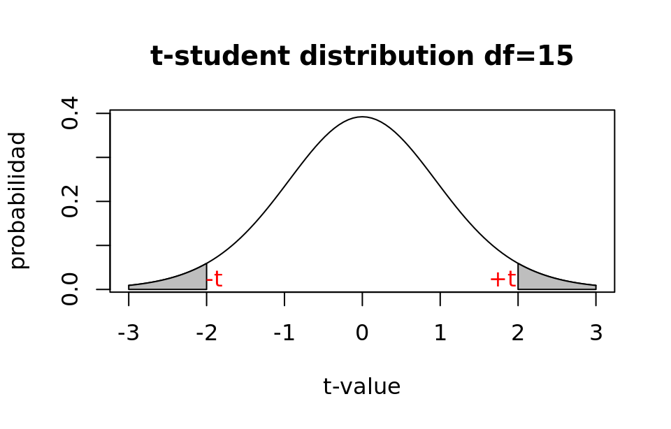 Supóngase que se busca el \(\text{valor}\) \(t\) para un intervalo de confianza del \(95\%\) en una distribución \(t-student\) con \(15\) grados de libertad: