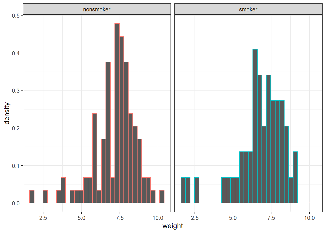 \(10\%\)de la población. - Normalidad: Las poblaciones que se comparan tienen que distribuirse de forma normal. A pesar de que la condición de normalidad recae sobre las poblaciones, normalmente no se dispone de información sobre ellas por lo que las muestras (dado que son reflejo de la población) tiene que distribuirse de forma aproximadamente normal. En caso de cierta asimetría los t-test son considerablemente robustos cuando el tamaño de las muestras es mayor o igual a